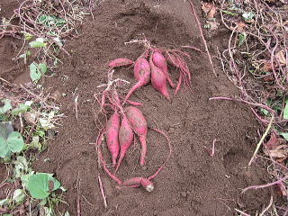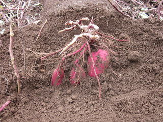 右上の写真のところから、手で掘っていくと、3本のさつまいもが見えてきました。