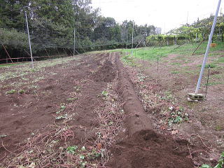 左のウネのビニールをはがし、ウネの上にさつまいものツルを出してあります。