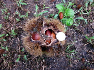 イガに入った栗は、下の写真のように足を使って栗拾いを楽しんで下さい。